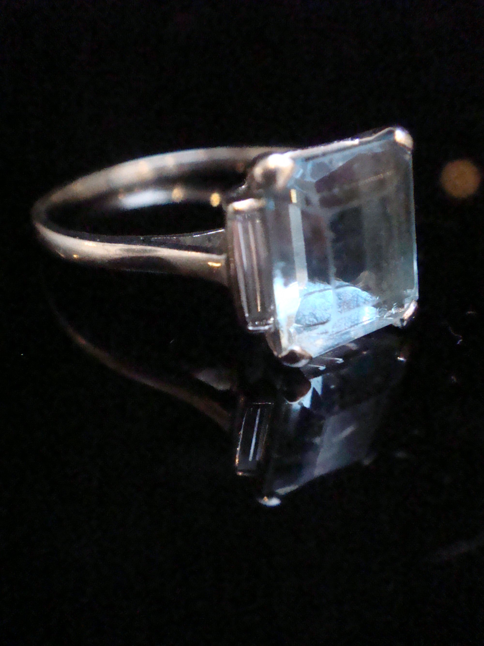 1930s 18CT WHITE GOLD NATURAL AQUAMARINE AND BAGUETTE CUT DIAMOND RING