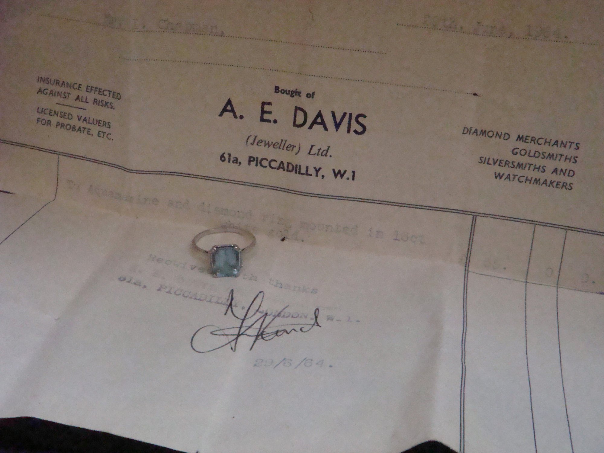 An original 1920-30s Natural aquamarine and baguette cut diamond cluster ring set into 18ct white gold with original purchase reciept from Picadilly W.1 London dated 1964