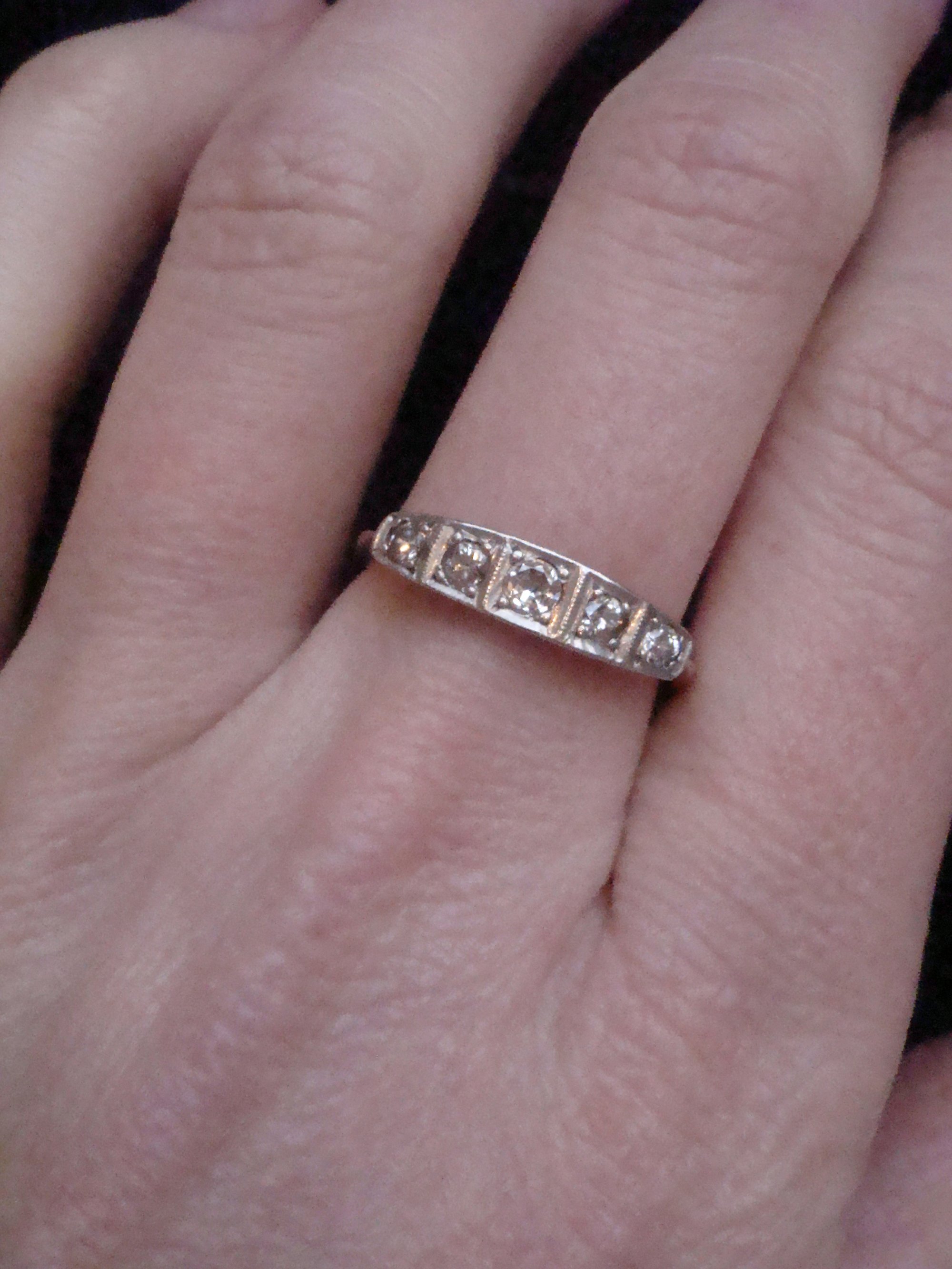 Set within the platinum setting sit 5 natural old cut diamonds measuring from 2-3mm. Total diamond weight is 0.35ct